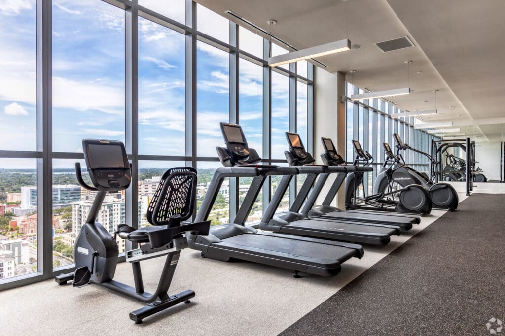 Gym equipment facing the window with city views
